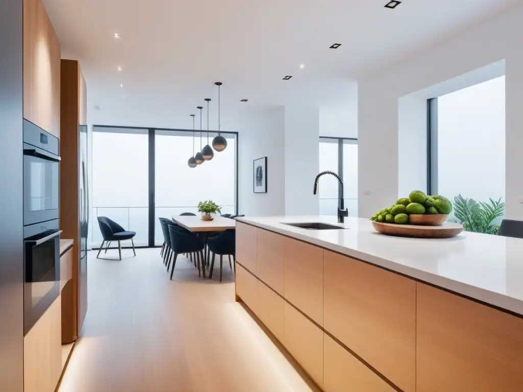 Una cocina moderna y elegante con electrodomésticos de cocina vegana de consumo eficiente, integrados en un diseño minimalista y luminoso